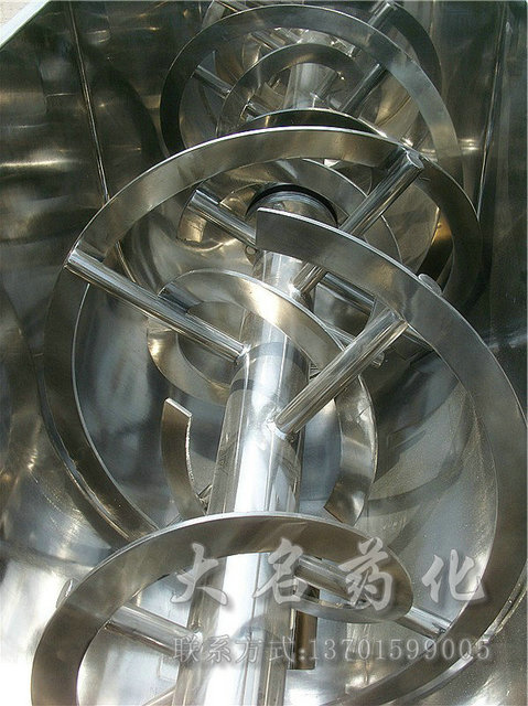 該機(jī)型由容器、螺旋攪拌葉片和傳動(dòng)部件組成:螺旋葉片一般做成雙層或三層,外層螺旋將物料從兩側(cè)向中央?yún)R集,內(nèi)層螺旋將物料從中央兩側(cè)輸送,形成對(duì)流混合。